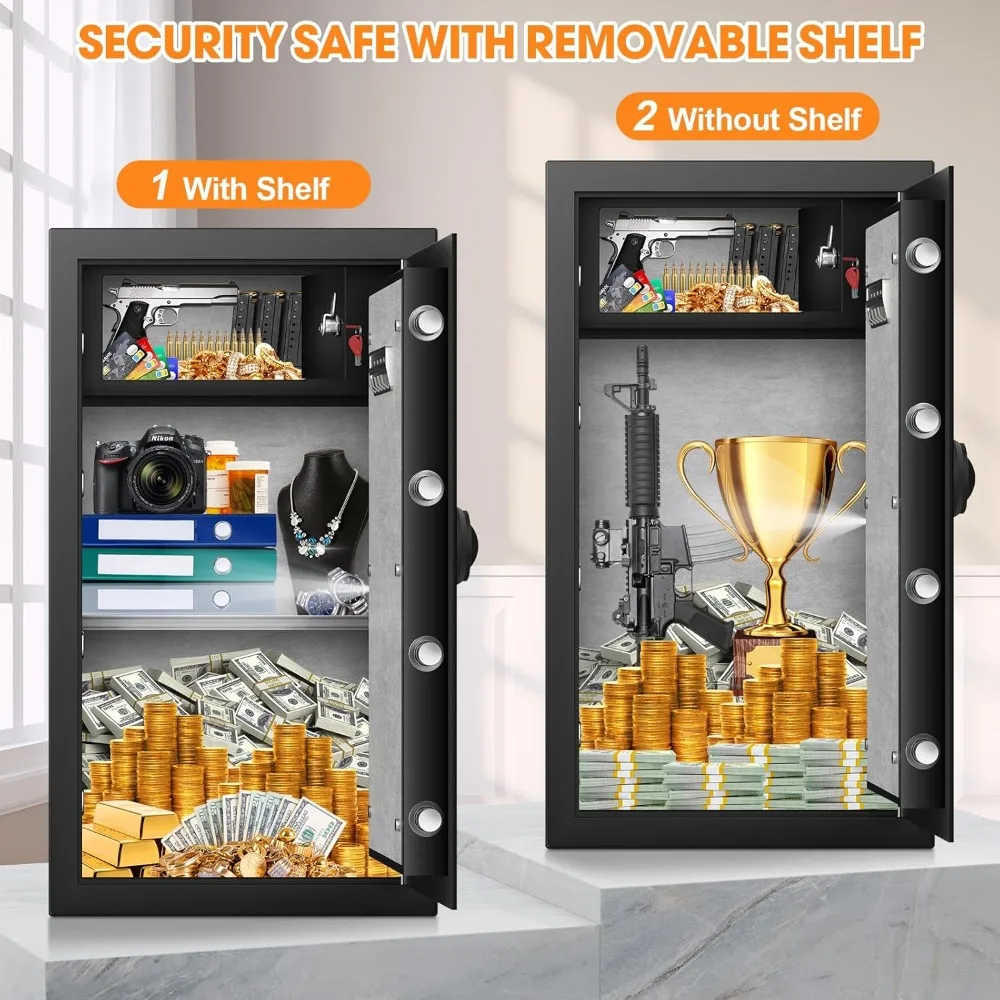 - LARGE SAFE BOX FOR HOME USE: Our home safe has a large capacity of 5.0 Cubic, The interior size is 15″ x 12″ x 26.5″. It is not only great for keeping items from prying eyes in your home such as sensitive documents, electronic storage drives, spare credit cards, medicine, gun etc, but also can protect your valuables from theft, children or nosey visitors