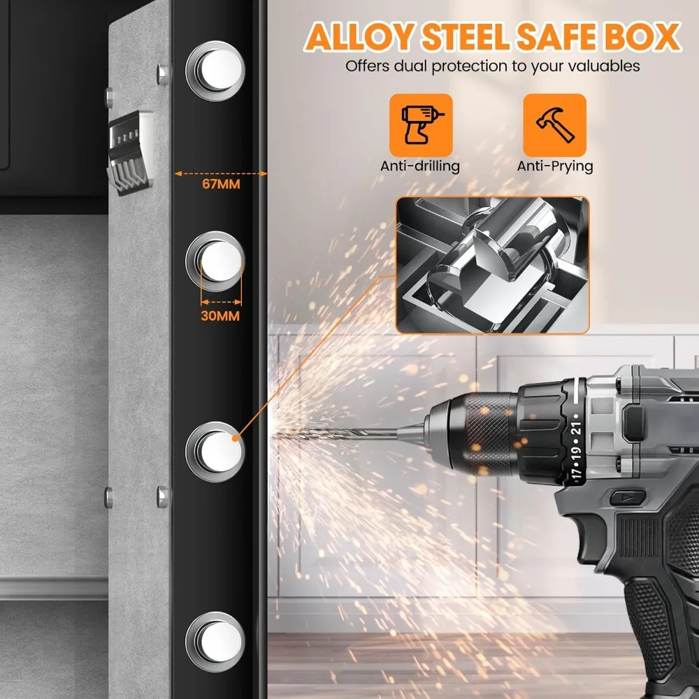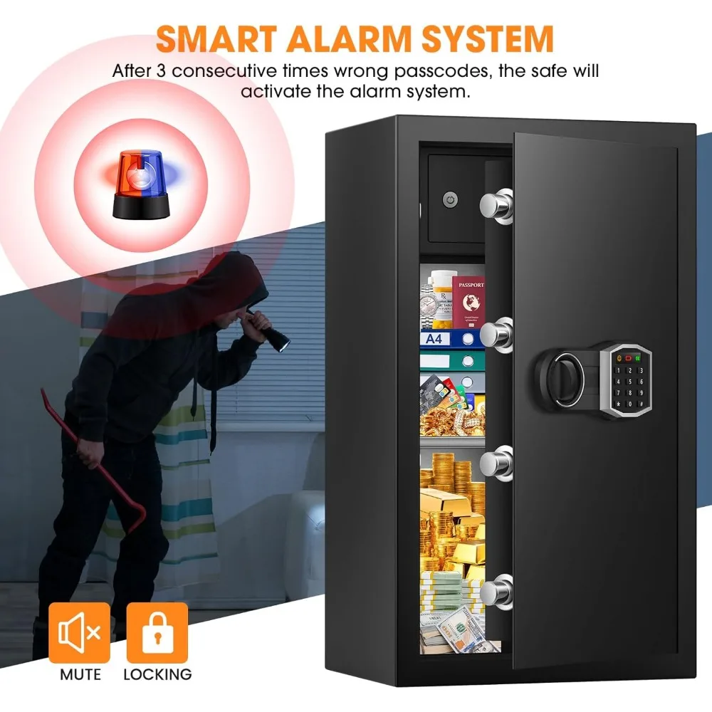 - ANTI-THEFT ALARM & ANCHORING DESIGN: Our fireproof safe comes with a dual alarm system to prevent password guessing and effectively deter unauthorized access. Enter the wrong password 3 times in a row will activate the alarm system and the safe will lock for 20 seconds. Anchoring design makes you easily fix the safe to the wall or floor, improving safety and reliability