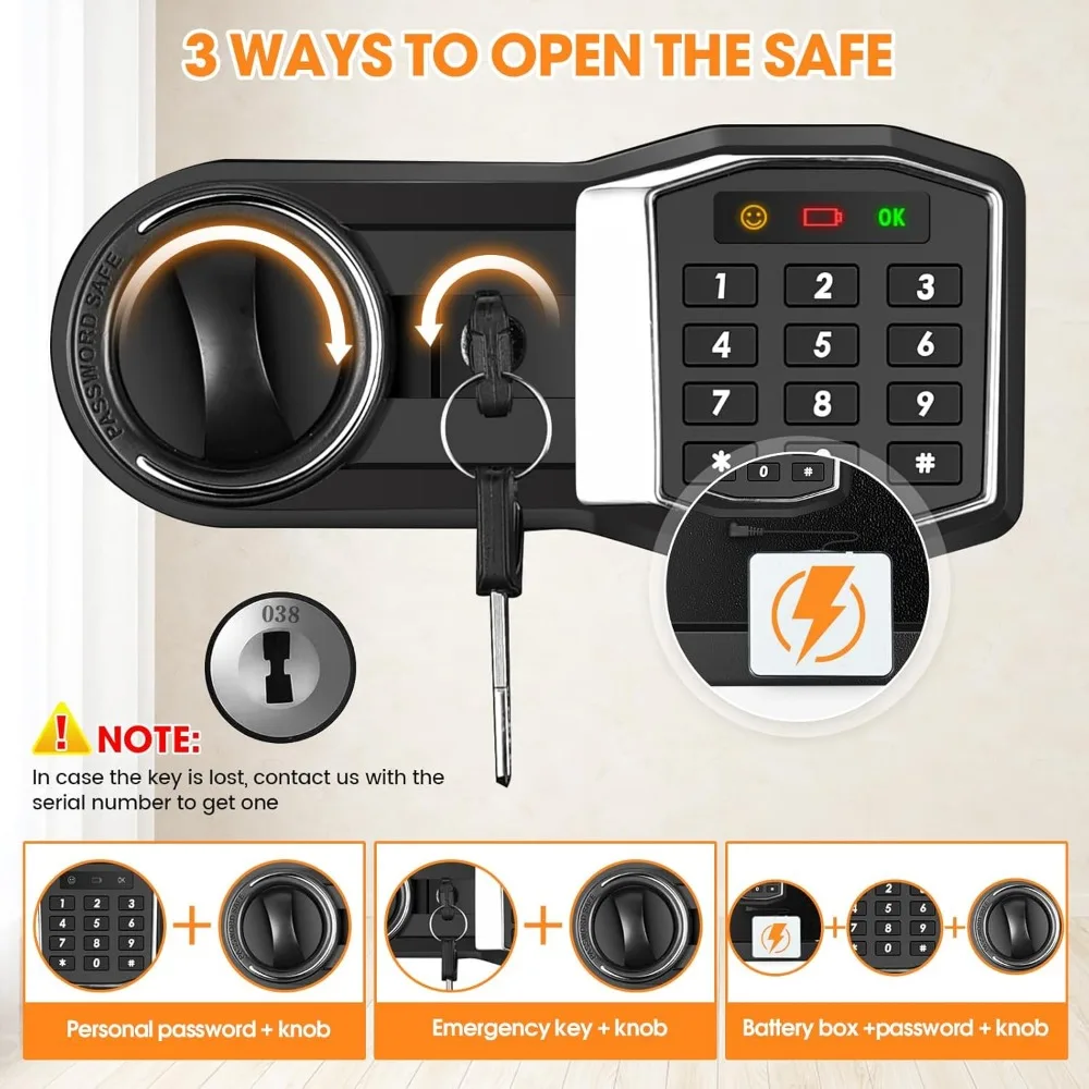 - TWO UNLOCKING WAYS: Our safe box is designed with digital keypad and spare keys. ① Use the emergency key to open the safe when your forget the password. ② Open the safe with password in your daily use and don’t have to worry about hiding & keeping track of a key. External battery case to prevent emergencies when the battery is dead and the key is not present
