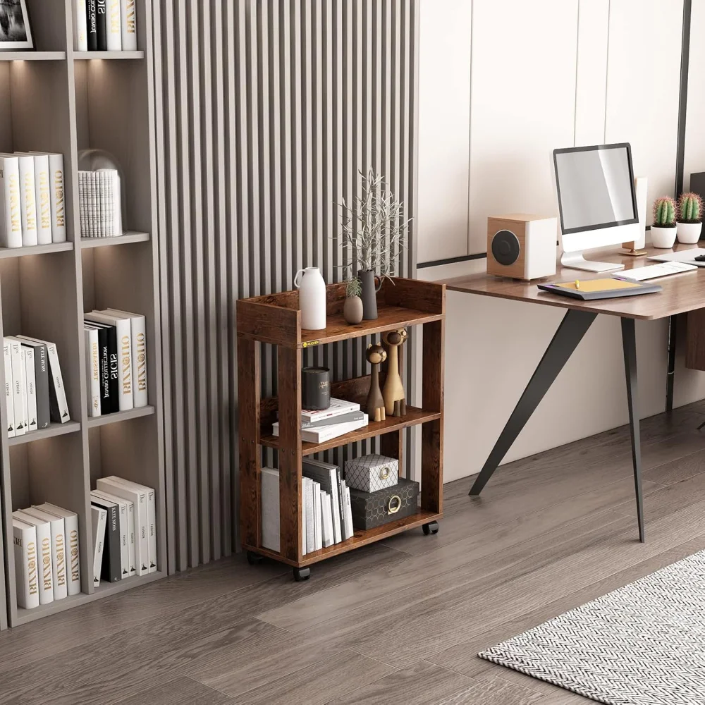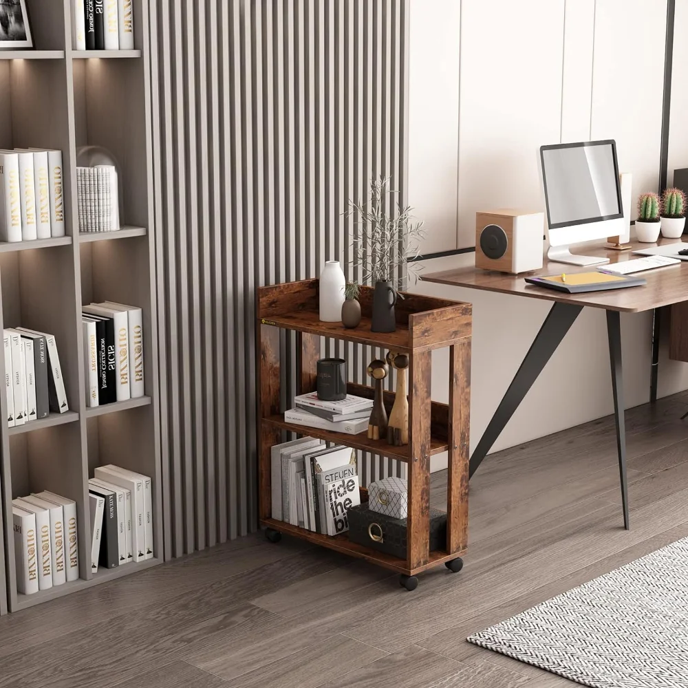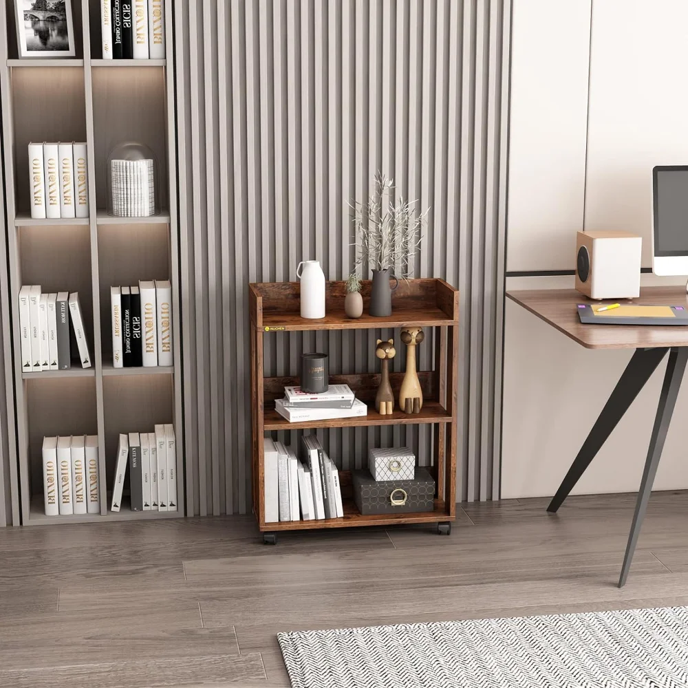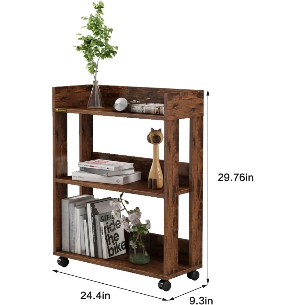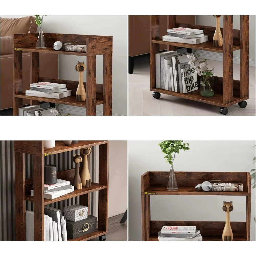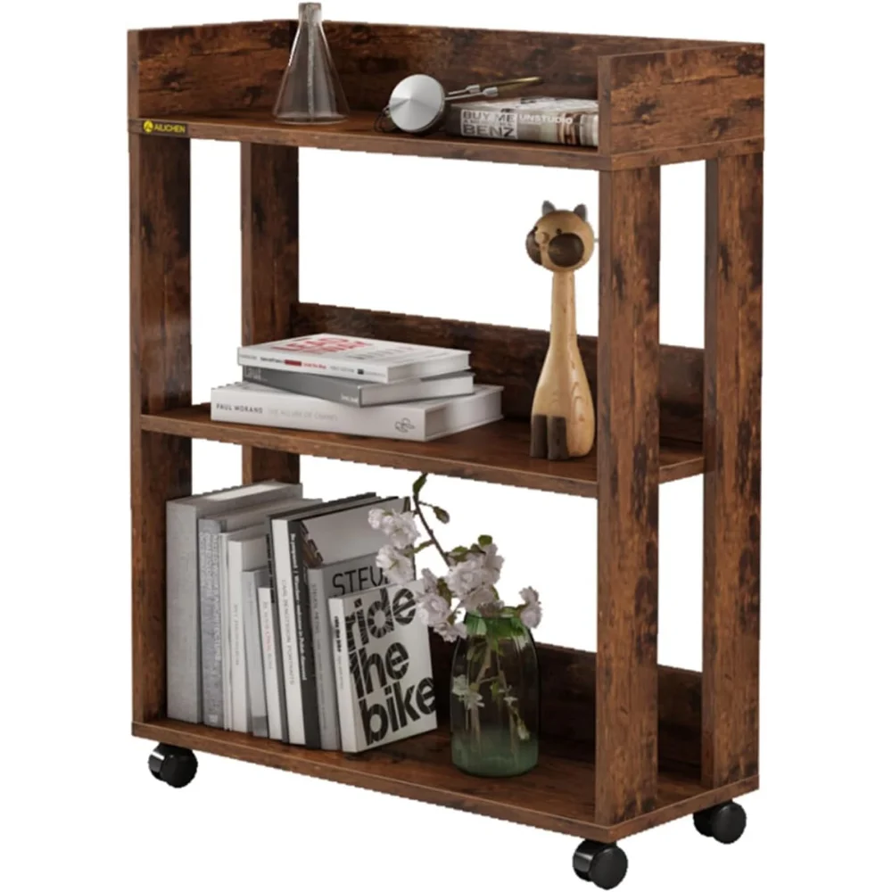 Specifications: Material: 15mm MDF panels Design and Style: Vintage Rustic Usage and Purpose: Multipurpose storage solution for books, magazines, plants, and small items Typical Adaptive Scenario: Living room, bedroom, office, library Shape and Size: 3 Tier Nightstand with Wheels Performance and Property: Sturdy load-bearing capacity, detachable universal wheels Features: |Living Room Storage Rack| **Versatile Storage and Style** The Bookcase Living Room Storage Shelf is a versatile piece that serves as a bookshelf, a small bookshelf, and a nightstand. Its vintage rustic style complements a variety of decoration styles, from boho to modern, making it a perfect addition to any home. The thick 15mm MDF panels not only enhance the overall stability but also provide a great load-bearing capacity, ensuring your books and decorative items are securely stored. **Effortless Mobility and Stability** This bookshelf is not just about style; it's also about convenience. The detachable universal wheels offer the flexibility to move the shelf around your home office or living room with ease. The built-in brakes ensure the shelf stays in place when you need it to, providing both mobility and stability. Whether you're using it as a nightstand or a bookshelf, the wheels can be easily detached, giving you the option to use it as a static piece of furniture. **Easy Assembly and Functional Design** The Bookcase Living Room Storage Shelf is designed for easy assembly, so you can start organizing your space right away. Its 3 tier open shelf design provides ample storage space for books, magazines, plants, and other small items, making it a practical solution for decluttering your living room or office. The thick MDF panels ensure that the shelf is not only aesthetically pleasing but also built to last. Its compact size and lightweight design make it a perfect addition to any space, whether it's a small apartment or a cozy corner in a larger home.