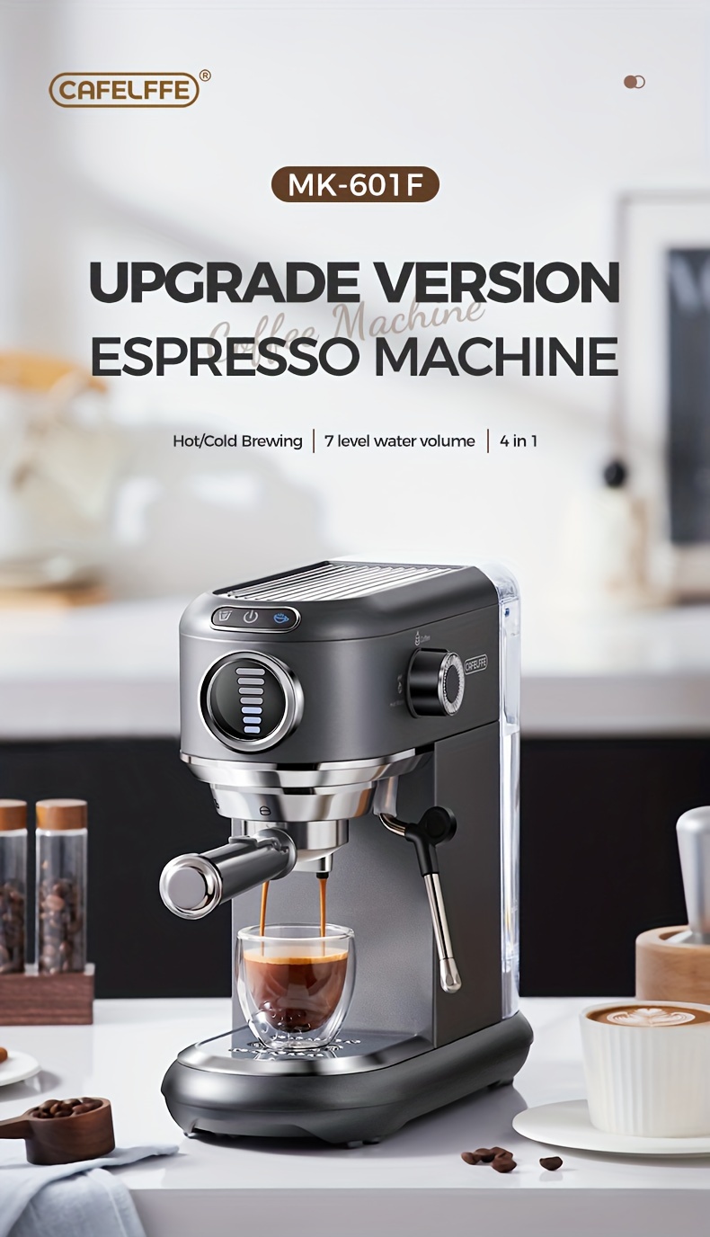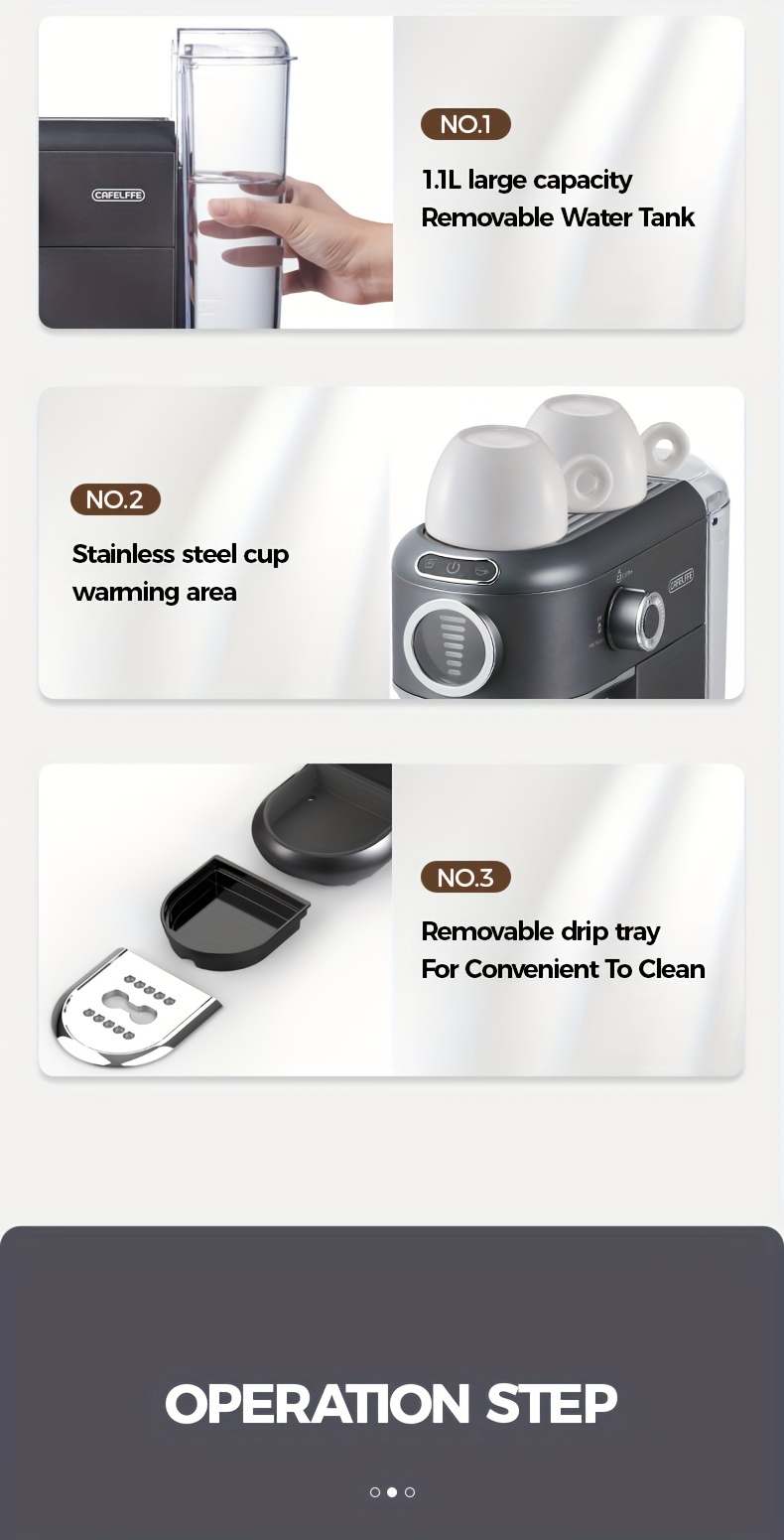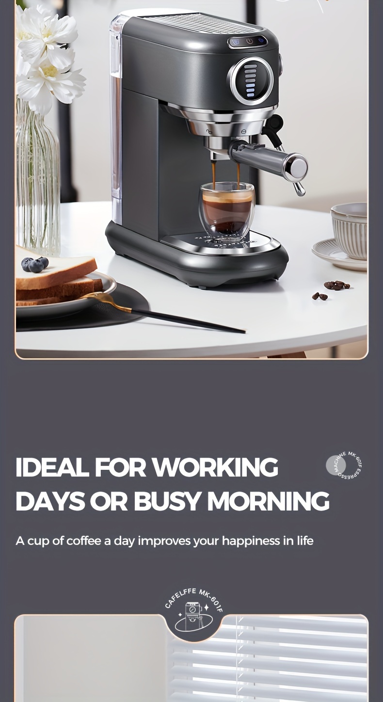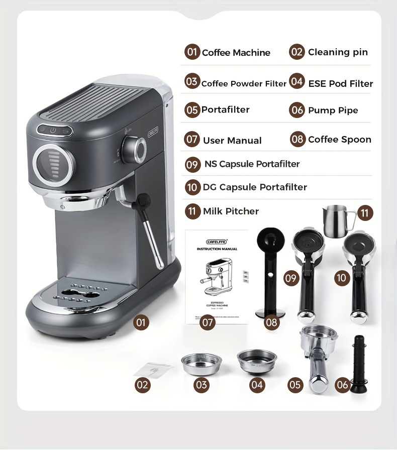 Would you like to start your day with a delicious cup of coffee? Check out our new coffee machine: The Cafelffe Coffee Maker is a versatile coffee maker that can be programmed and has a customizable settings panel, as well as a milk frother. It offers full functionality, allowing you to use ground coffee, ESE pods, Nespresso capsules, and Dolce Gusto capsules. This machine brews coffee quickly in just 25 seconds with the push of a button, thanks to its 19-bar pressure system that extracts maximum flavor from the coffee beans.