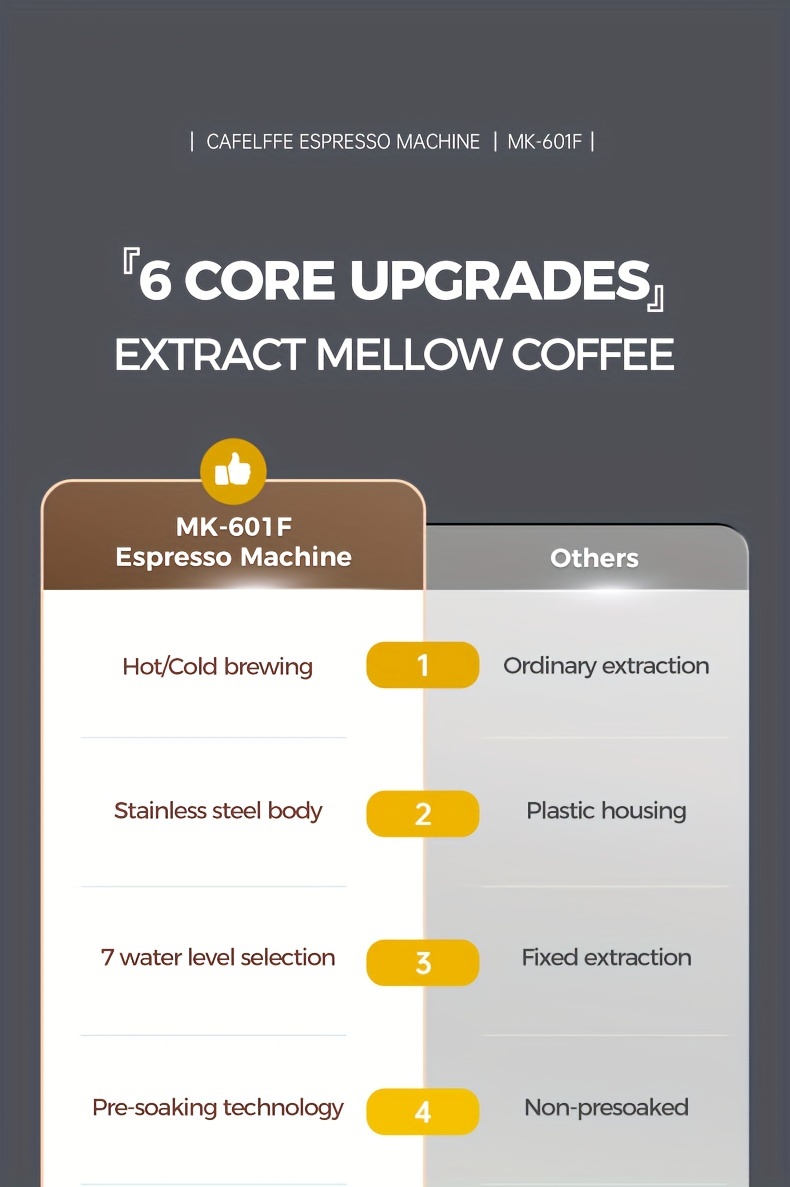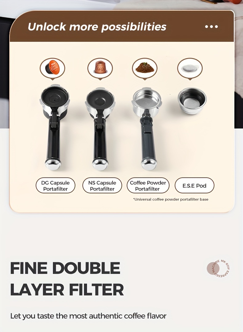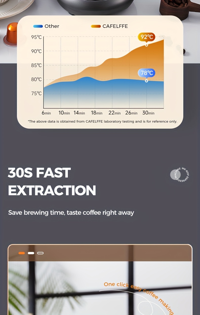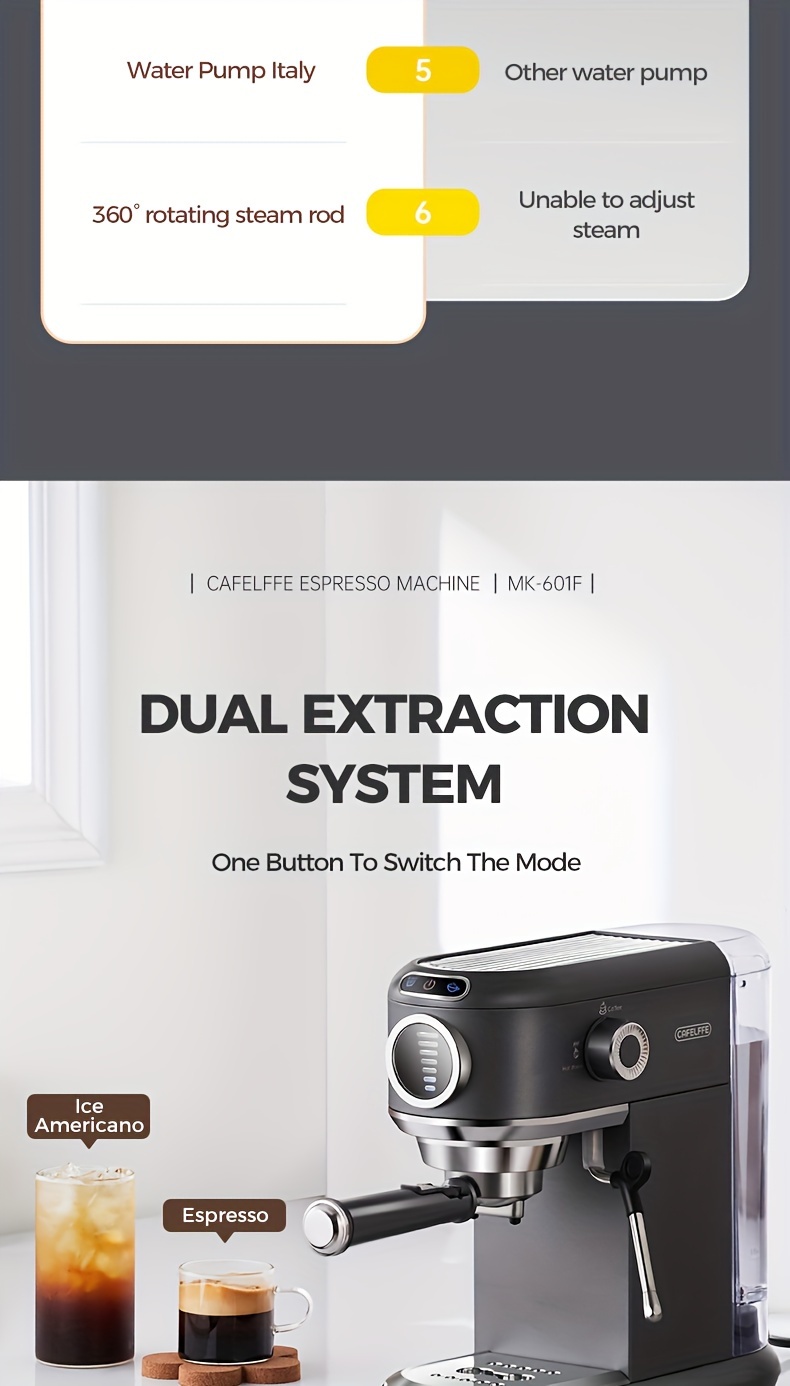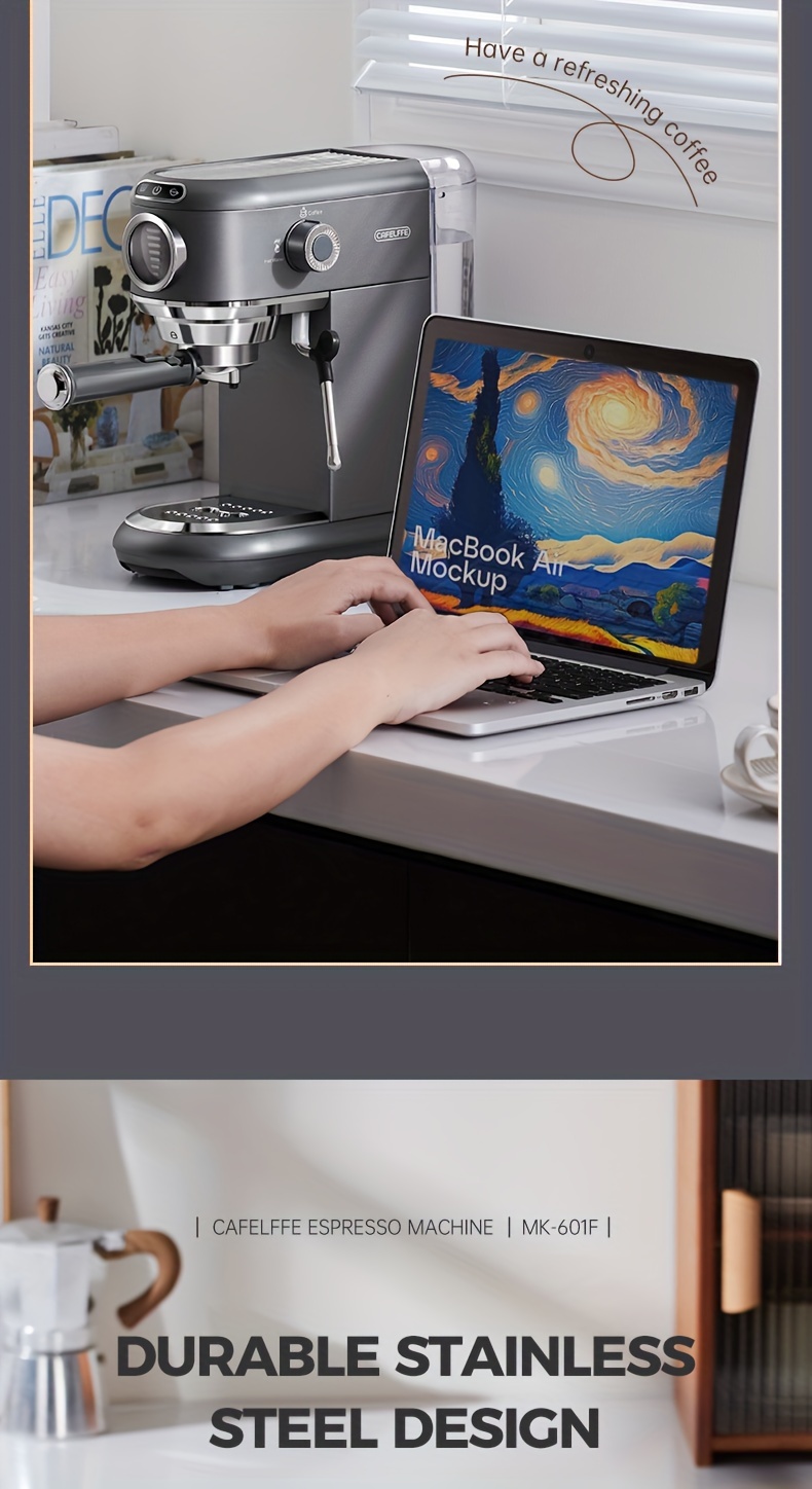 Would you like to start your day with a delicious cup of coffee? Check out our new coffee machine: The Cafelffe Coffee Maker is a versatile coffee maker that can be programmed and has a customizable settings panel, as well as a milk frother. It offers full functionality, allowing you to use ground coffee, ESE pods, Nespresso capsules, and Dolce Gusto capsules. This machine brews coffee quickly in just 25 seconds with the push of a button, thanks to its 19-bar pressure system that extracts maximum flavor from the coffee beans.