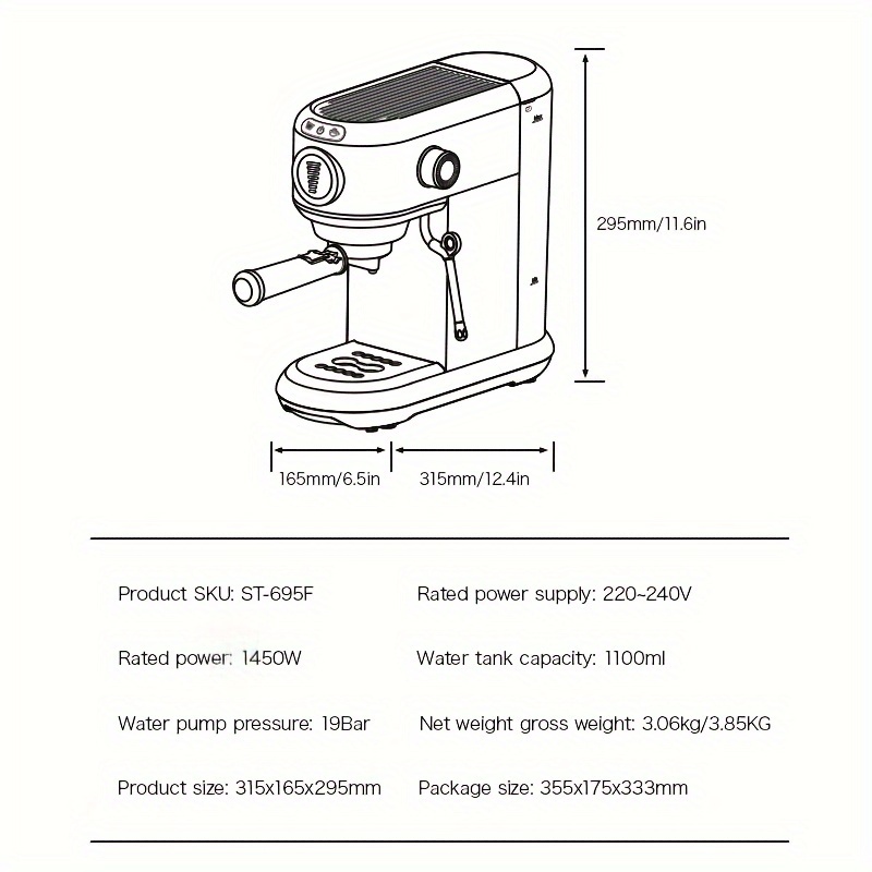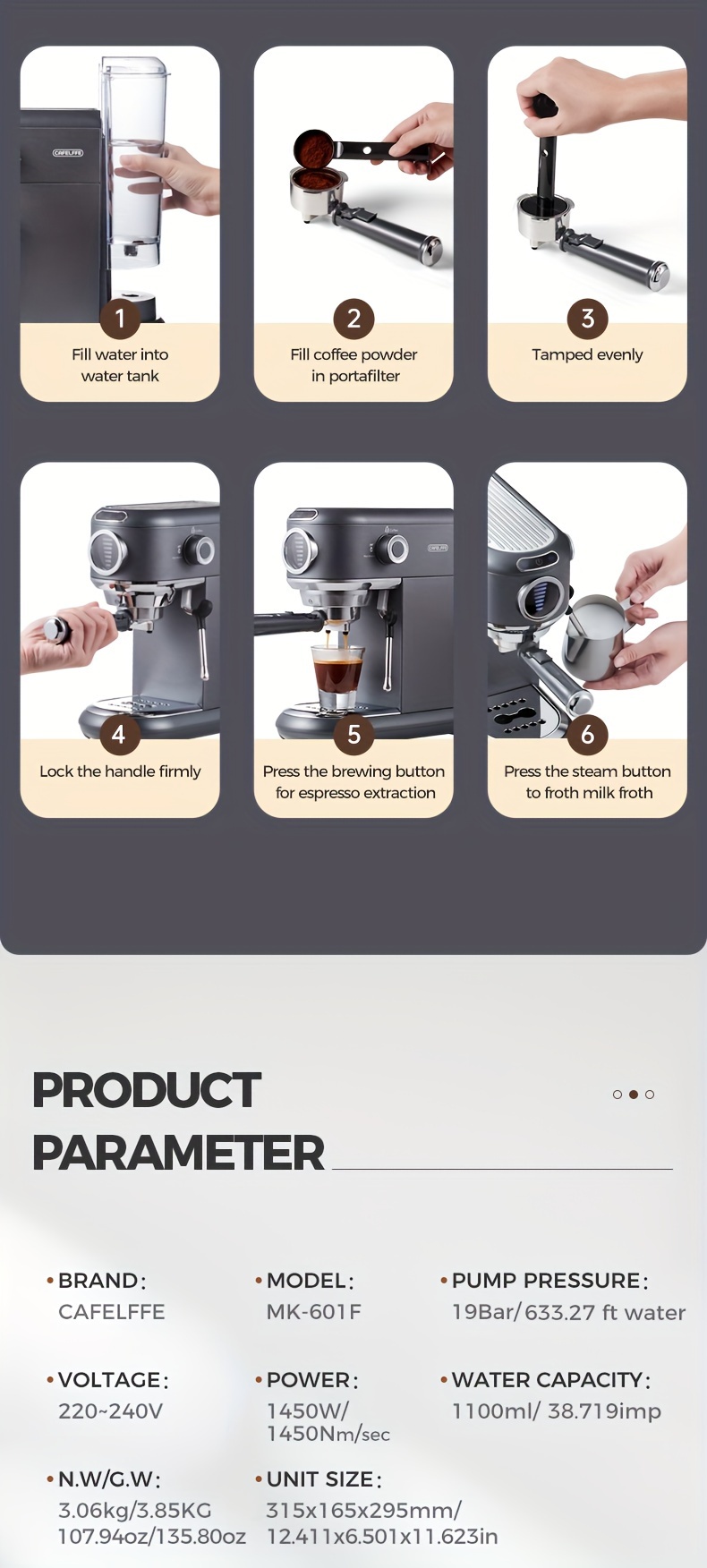 Product Details: 1️⃣ Voltage: 220-240V,50/60Hz 2️⃣ Power: 1450W 3️⃣ Plug: EU plug 4️⃣ Pressure: 19 Bar 5️⃣ Color: Gray 6️⃣ Material: stainless steel
