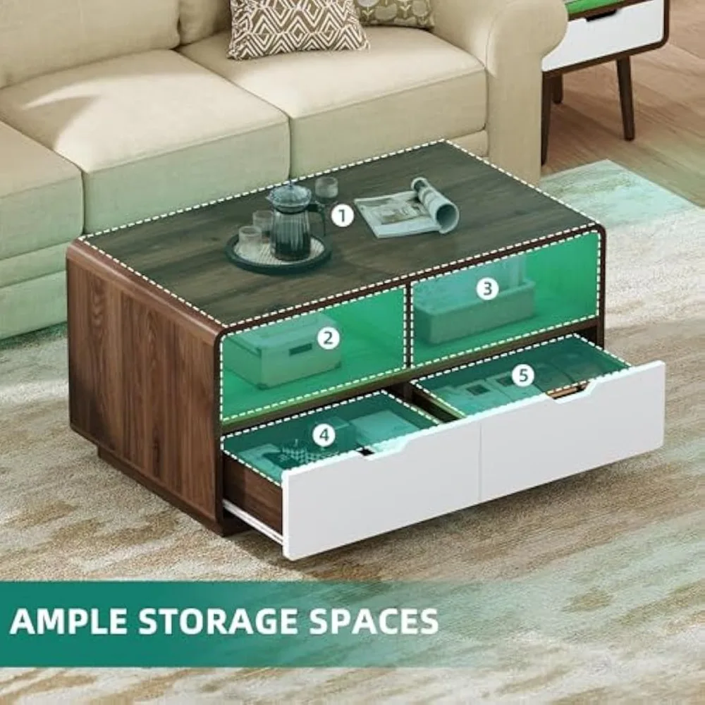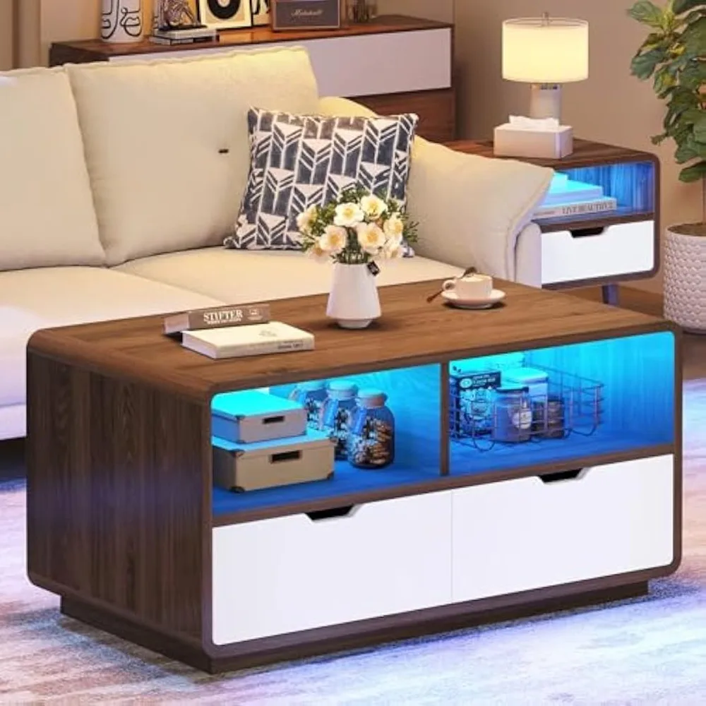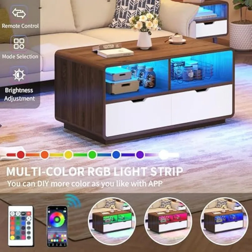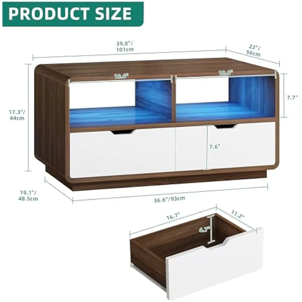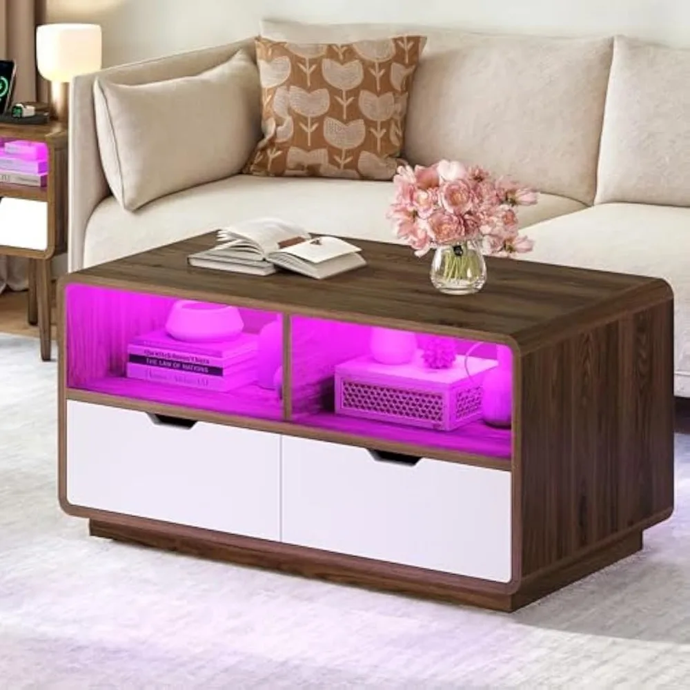 - Generous storage capacity: LED coffee table boasts two ample drawers and two open compartments. Organize your remote controls, magazines, and other essentials as you please. Embrace the prospect of a tidy living space right at your fingertips
