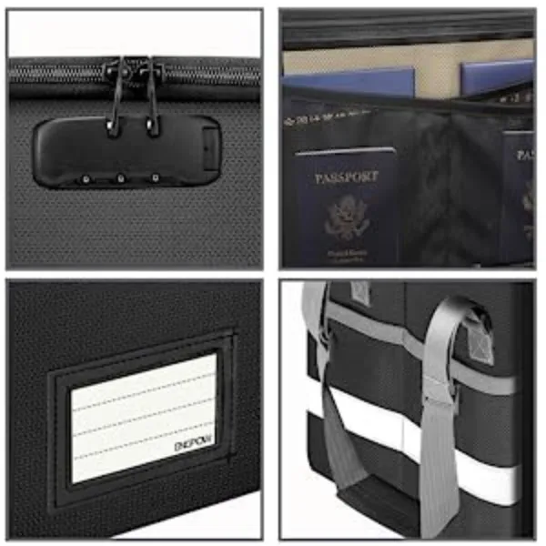 - Portable and secure: High quality combination lock design for added storage security, includes instruction manual for combination lock. Sturdy adjustable handle makes it easy to carry everything you need(You can adjust the carrying handle to the length you want), two zippers make it easier to open and close the box, Side pockets and label slots let you store small items and labels.The file lock box collapses down simply for easier storage when not in use.