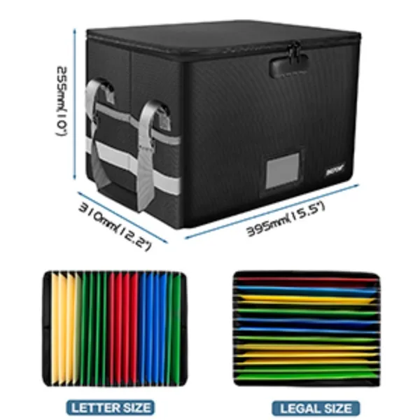 Dimensions: 15.55″ x 12.2″ x 10″.The fireproof file lock box fit both letter and legal size files fitting your filing system.