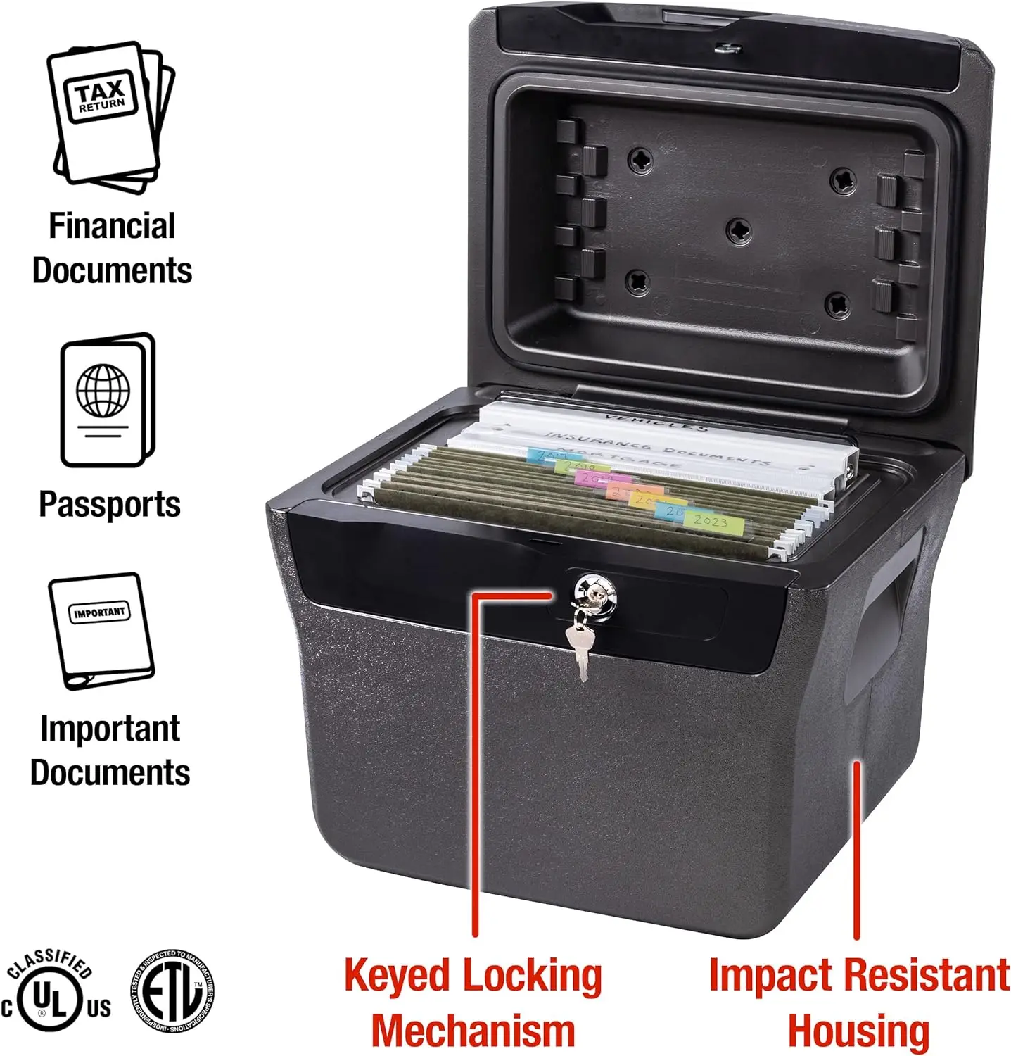 - DOCUMENT STORAGE: Fire box accommodates letter-size hanging files and folders (sold separately) for easy storage of passports, social security cards, and birth certificates