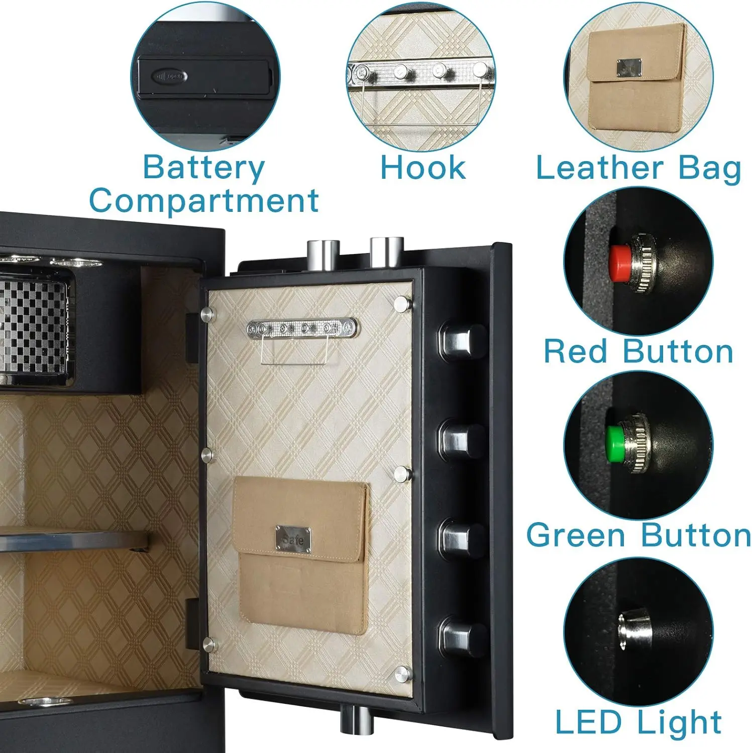 - ✅【BETTER CONFIGURATION】: As soon as you open the security box, the light will light up and go out automatically after 30 seconds. The inside of the safe is covered with leather to prevent wear and tear of valuables. The safe box also has an emergency external battery pack. When the internal battery is exhausted, you can plug it in to provide emergency power.