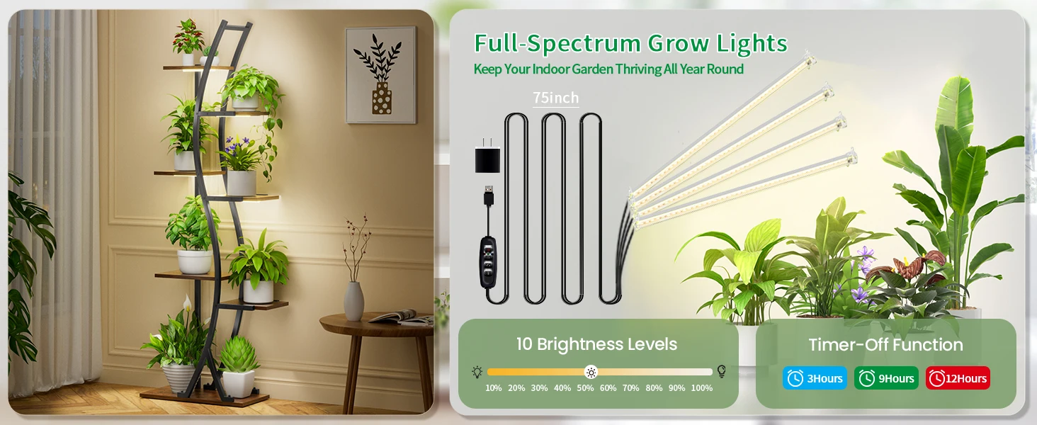 - 【Plant Stand with Grow Light】This plant stand is equipped with 4-head full-spectrum grow lights that are timer-enabled and multiple adjustable, designed for healthy growth of your plants indoor. With the versatile grow light ensures your plants thrive, even in low-light conditions, saves you the trouble of moving plants outdoors to absorb light.