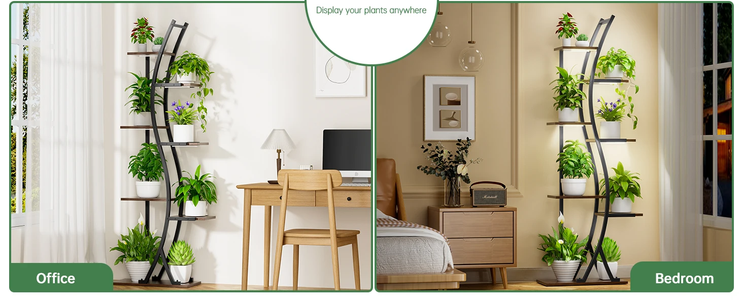 Specifications: Material: High-Quality 0.8mm Thick Iron Pipe Frame, 15mm Thick Particleboard Shelves Design and Style: Elegant "S" Curve, Modern Decorative Piece Usage and Purpose: Indoor Plant Stand with Grow Light, Versatile Flower Stand Display Typical Adaptive Scenario: Living Room, Bedroom, Balcony, Patio Shape or Size or Weight or Quantity: 7-Tier, 62" Tall Plant Stand Performance and Property: Durable, Sturdy, Rust-Resistant, Water-Resistant Features: |Estanterias Para Plantas| **Elevate Your Indoor Gardening Experience** Introducing the 62 Inch 7-story Metal Indoor Plant Rack, a modern marvel designed to enhance your home's aesthetics while providing the perfect environment for your indoor plants. This plant stand is not just a functional piece of furniture; it's a statement piece that combines practicality with style. With its sophisticated "S" curve design, it adds a touch of elegance to any corner or blank wall, making it an ideal choice for those who appreciate a blend of functionality and art. **Optimal Growth Conditions for Your Plants** This plant stand indoor is equipped with a state-of-the-art 4-head full-spectrum grow light, which is essential for healthy plant growth in low-light conditions. The grow light is not only adjustable but also timer-enabled, ensuring your plants receive the right amount of light at the right time. Whether you're cultivating delicate orchids or hearty succulents, this plant stand with grow light provides the ideal environment for your plants to thrive. **Adaptable and Sturdy** The plant stand's sturdy 0.8mm thick iron pipe frame, coupled with high-quality 15mm thick particleboard shelves, guarantees both durability and stability. The iron pipes are coated with a special paint to prevent rust, while the shelves are treated with a water-resistant coating, making it easy to clean and maintain. This plant holder is designed to be an indestructible part of your home decor, withstanding the test of time and the elements. Its safety features, including a furniture strap to secure the stand to the wall, ensure that it remains a safe and secure addition to your space, even with children or pets around.