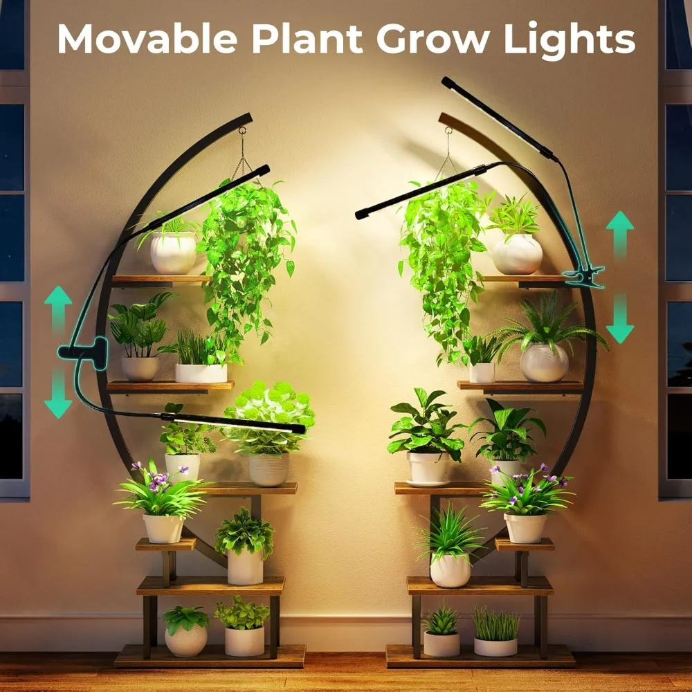 - With Adjustable Grow Lights: Our plant stand offers two movable plant grow lights, you can choose where to place the lights according to the growth of your plants to promote healthy growth. In addition, this two dual head grow lights has 3 modes, 6 level dimmable and 3 timing settings, which can meet the lighting needs of plants at different growth stages.