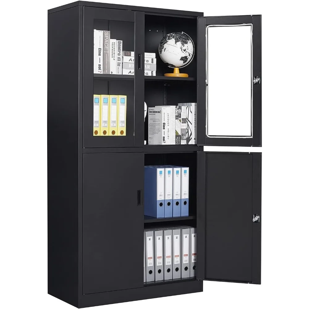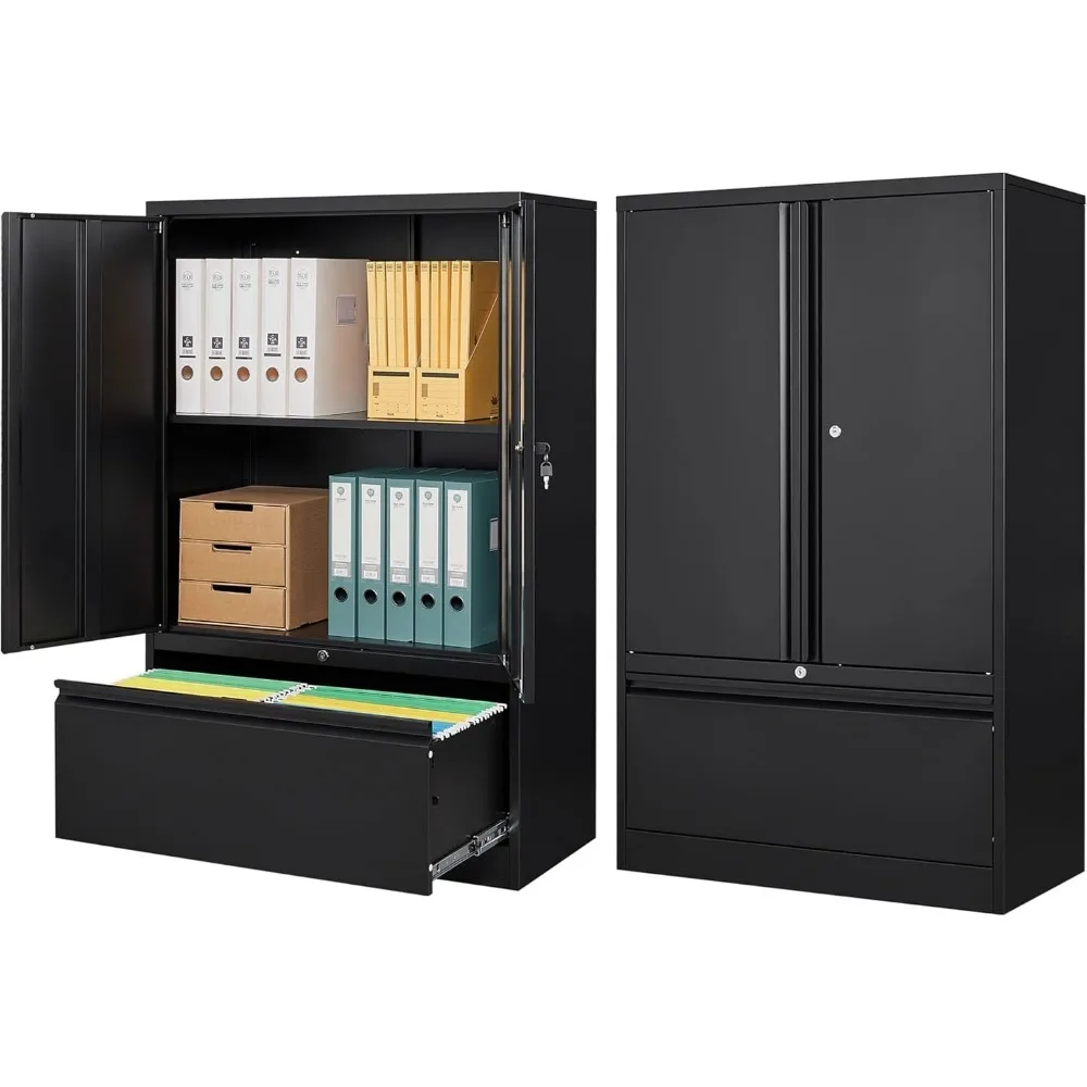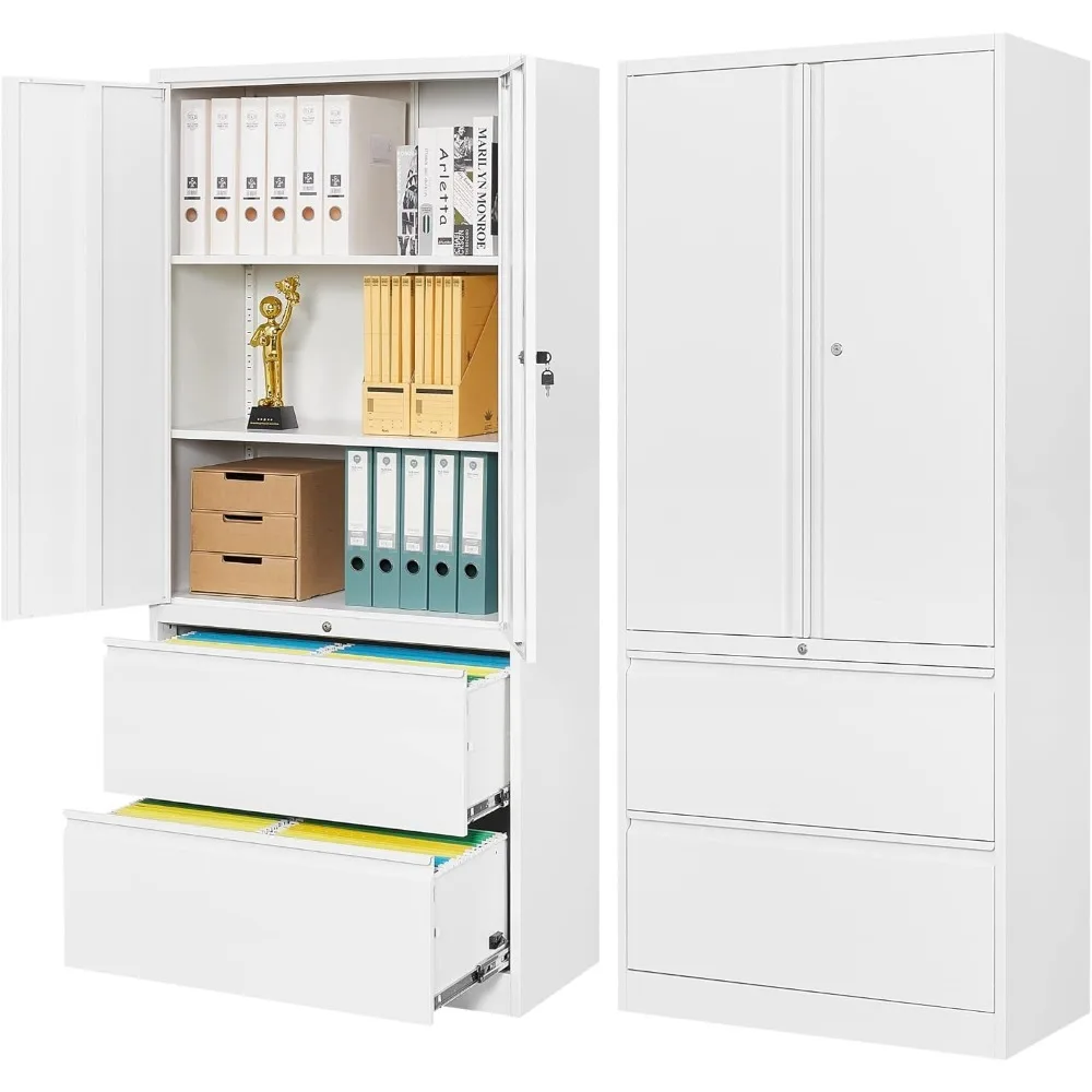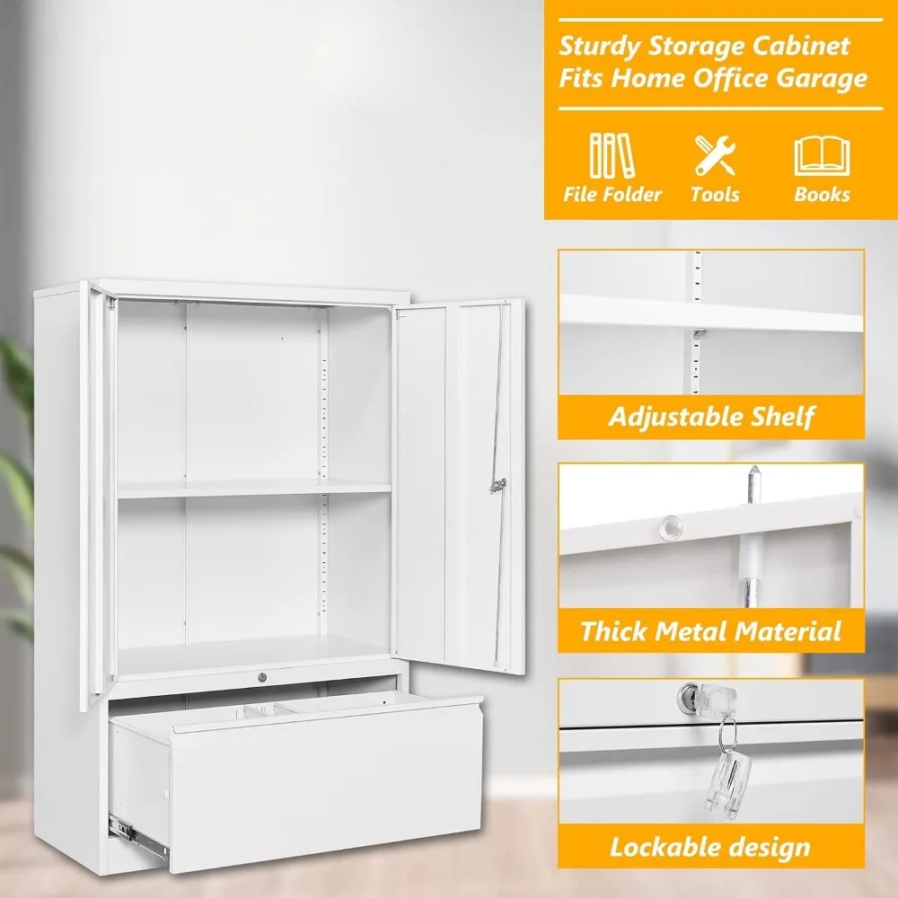 - 【MULTIFUNCTIONAL FILE CABINET】This metal cabinet combines the functions of filing cabinet and storage cabinet. Equipped with two drawers for letter/legal/A4 size documents. Above the filing cabinet, there is a storage cabinet with two shelves, The layered and combination design allows it to be used as a lockable office cabinet.