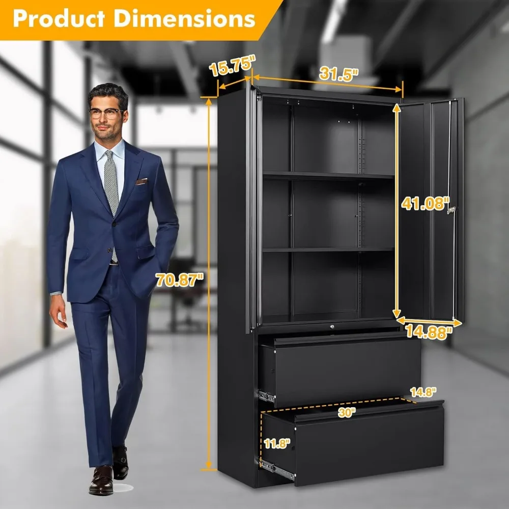- 【MULTIFUNCTIONAL FILE CABINET】This metal cabinet combines the functions of filing cabinet and storage cabinet. Equipped with two drawers for letter/legal/A4 size documents. Above the filing cabinet, there is a storage cabinet with two shelves, The layered and combination design allows it to be used as a lockable office cabinet.