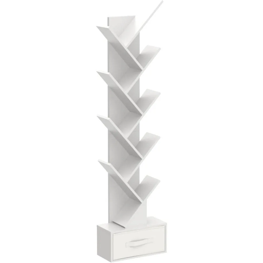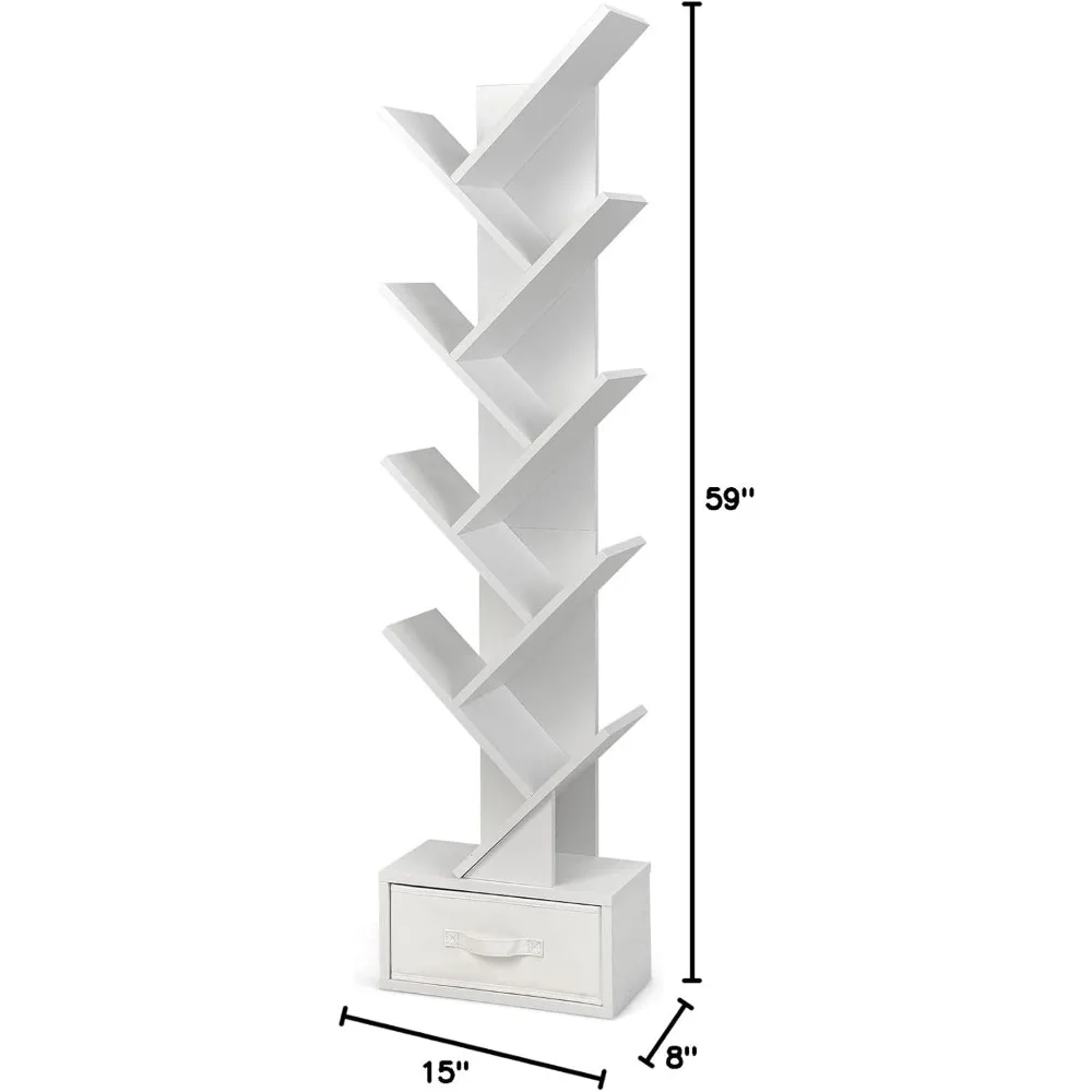 - [10-Shelves Design & Large Capacity]: The tree-shaped bookshelf provides large storage capacity with its 10 shelves, hollow base and removable fabric drawer. And the proper width of 8″ makes each tier well accommodate your favorite books, albums, CDs and other collections. Besides, the open shelves keep these items in easy reach.